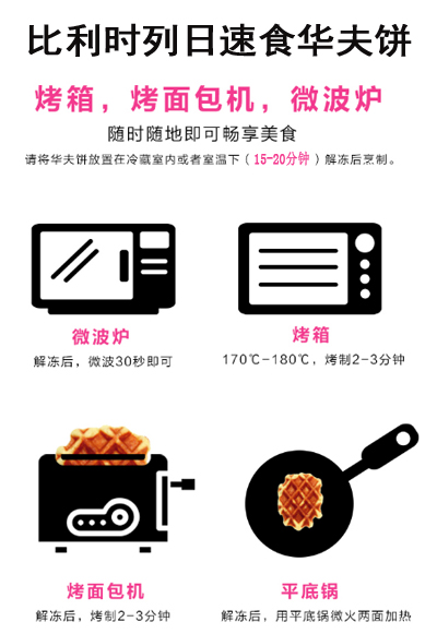 食用小貼士:解凍15-20分鐘后,可放入平底鍋或者微波爐或者烤箱或者面包機烤制,即可品嘗到正宗的比利時列日華夫餅干,可搭配巧克力、草莓、菠蘿等水果、奶油、冰淇淋等。