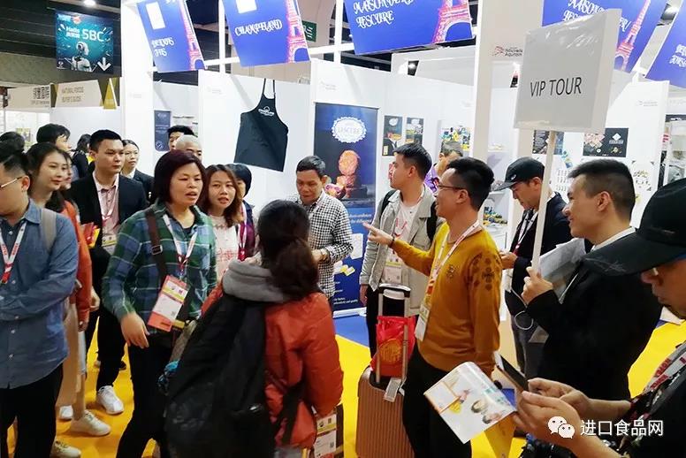 進口食品網(wǎng)買家團在Hofex展會代表的帶領(lǐng)下參觀各國展商產(chǎn)品