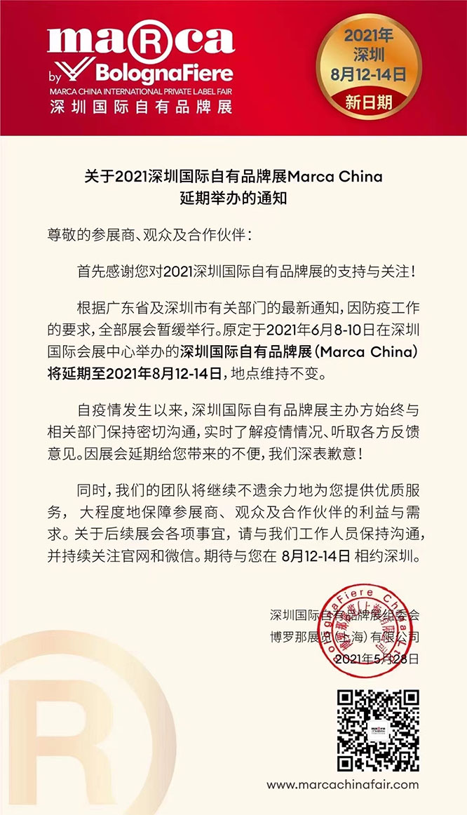 深圳國際自有品牌展(Marca China)將于2021年8月12日至14日在深圳國際會展中心(寶安新館)隆重召開,由意大利博洛尼亞展覽集團在華全資子公司博羅那展覽(上海)有限公司主辦,與意大利博洛尼亞展覽集團和博洛尼亞國際自有品牌展及峰會合作。作為一個國際自有品牌展入駐中國的展會,深圳國際自有品牌展不僅為高品質生產廠商拓展其自有品牌銷售渠道,還為其開發經銷與電商渠道。本屆展會計劃展出面積逾20,000平方米,將吸引來自近30個國家與地區的500余家展商以及20,000多名專業觀眾。展品范圍將包括食品、生鮮、有機產品、家居用品、美容個護、休閑用品、寵物食品及產品、包裝/技術及服務和零售及電商等領域。