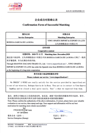 2021年3月,西班牙會員企業PROCEO'S WINES/BODEGA GARCIA DE LA ROSA確認與進口食品網推薦的中國買家——歐配進出口有限公司成功對接事宜,現中國買家已采購一批西班牙葡萄酒,預計4月份抵達中國市場。酒莊負責人David先生在確認函高度評價,“我們非常滿意進口食品網的服務,他們已協助我們的葡萄酒出口到中國市場,因為他們的對接,讓我們和中國買家的談判和交易過程更加快速和輕松,這是我們酒莊所期盼的?!?/span>