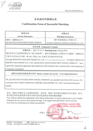 2021年3月,會員企業(yè)越南廣義省制糖股份公司(以下簡稱QNS)向進(jìn)口食品網(wǎng)發(fā)函確認(rèn)與推薦的中國買家——禾潤嘉進(jìn)出口有限公司成功合作事宜,近期fami貨柜已順利進(jìn)入中國市場的烘焙和水果等渠道銷售。廣義省制糖股份公司表示非常滿意進(jìn)口食品網(wǎng)的服務(wù),因?yàn)檫M(jìn)口食品網(wǎng)的協(xié)助,與中國經(jīng)銷商快速確認(rèn)合作,實(shí)現(xiàn)fami產(chǎn)品在線下鋪市。