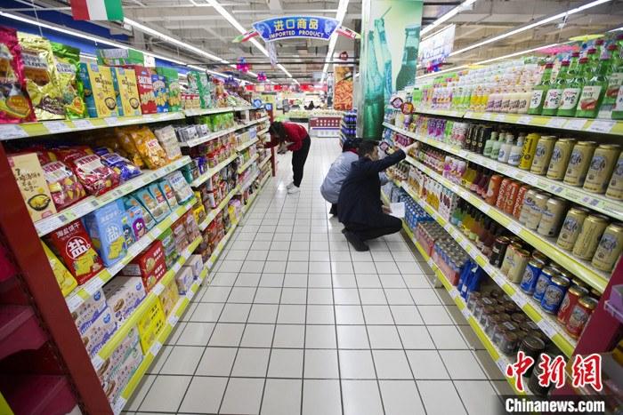 圖為4月9日,山西太原一超市,工作人員在整理進口商品貨架。 中新社記者 張云 攝