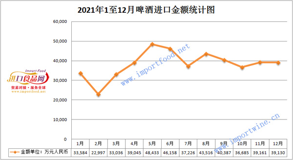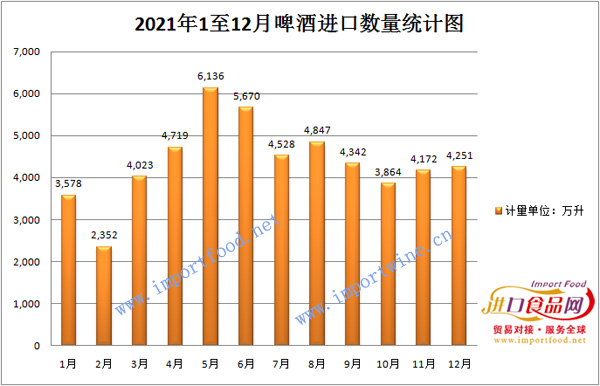 根據(jù)統(tǒng)計圖顯示,2021年5月全國啤酒進口量達到頂峰,此后出現(xiàn)回落,其中九個月進口量均超過4000萬升。