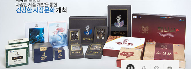 我們是韓國一家擁有海馬養殖技術的漁業公司,榮獲HACCP認證,使用濟州熔巖海水來養殖海馬,目前銷售中的有干海馬套裝和干海馬微粉以及功能性食品、健康輔助食品、化妝品、海馬茶,現在開發中的有海馬濃縮液、海馬酒、海馬配飾等。我們除了在韓國銷售,也出口到中國、中國香港、日本、新加坡等東南亞國家,并擴展到美洲、中東、俄羅斯、 阿拉伯、歐洲地區。