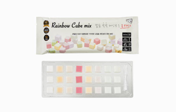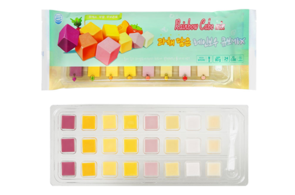 我們是韓國一家生產(chǎn)以彩虹顏色為設(shè)計理念,以各類水果和蔬菜搭配的奶酪凍干方塊。我們選用美國加利福尼亞的奶酪,再搭配草莓,芒果,香蕉,西瓜,青蘋果,藍(lán)莓和樹莓,采用自行設(shè)計的-50℃快速冷凍,保留原材料的新鮮,進(jìn)而加工成7種顏色的奶酪方塊。