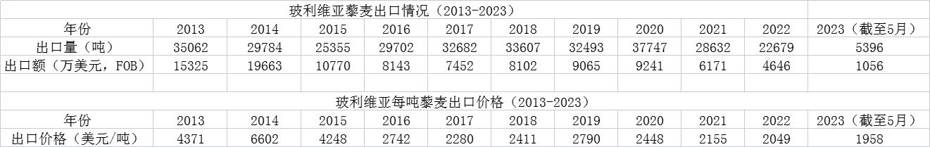 ?!独硇詧蟆?月22日報道,由于玻利維亞藜麥(Quinua)產(chǎn)量低、運費高,與其他國家相比競爭力低下,自2020年以來出口量及出口價格逐年下降。2022年,玻藜麥出口量2.27萬噸,同比下降20.8%,出口額4650萬美元,同比下降24.7%;2021年玻藜麥出口量和出口額分別同比下降24.1%和33.2%。藜麥出口價格由6602美元/噸(2014年)跌至1958美元/噸(2023年5月)。