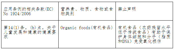 (1)該條例附件中規定的健康聲稱不應包括在(EC)No 1924/2006號條例第14(1)條規定的歐盟允許的健康聲稱清單中,禁止在有機食品使用“有機食品(農藥殘留水平低于傳統食品)有助于保護身體細胞和分子(脂質和DNA)免受氧化損傷”的健康聲明。