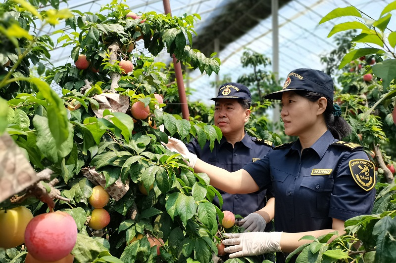 夏日果農碌,綠蔭瓜果香。近日,大連海關所屬鲅魚圈海關關員正在對即將成熟的油桃果園進行采摘前的最后一次檢查。幾天后,這批成熟的油桃將在幾公里外的蓋州市永昇果蔬有限公司加工包裝后出口。