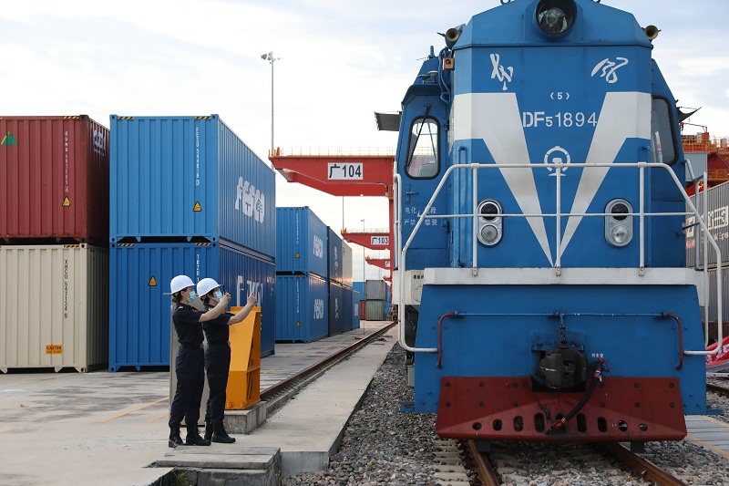圖為:關員在廣州國際港對中歐班列進行監(jiān)管 關悅/攝