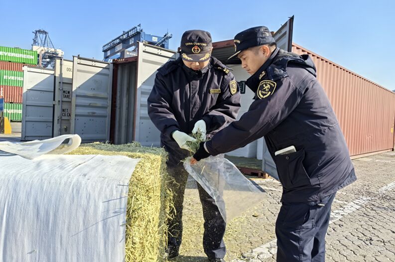 圖為:關員在天津新港海關東突堤集約查驗中心開展進口苜蓿草查驗作業 田思雨/攝