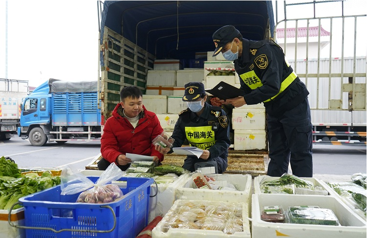 新春將至口岸忙。1月31日清晨,像往常一樣,一輛輛滿載新鮮瓜果蔬菜、魚蝦水產的貨車駛入拱北口岸,經海關監管驗放后奔赴澳門市場。