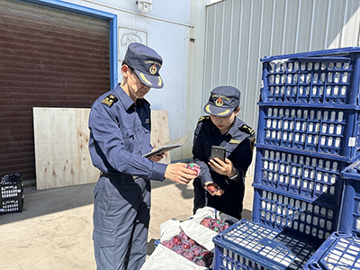 圖為:關員對出口水果開展查驗作業 賈小峰/攝