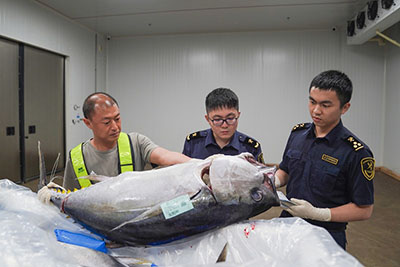 圖為:關(guān)員對進(jìn)境遠(yuǎn)洋捕撈冰鮮水產(chǎn)品進(jìn)行查驗(yàn)監(jiān)管 葉俊超/攝