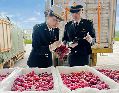 圖為:關員通過“集中查檢+鐵路快速通關”模式對出口水果開展現場查檢 戴瑋琪/攝