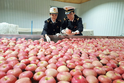 近日,大連大窯灣港一片“紅火”景象,產(chǎn)自大連瓦房店地區(qū)的66.87噸富士蘋果在海關關員的監(jiān)管下通關放行,即將搭乘貨輪前往泰國。