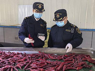 圖為:關員對出口辣椒開展監管 毛小龍/文
