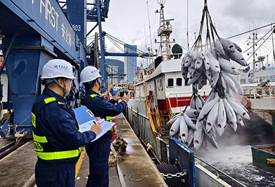 圖為:關(guān)員在漁船泊位邊對(duì)進(jìn)口金槍魚吊裝作業(yè)開展現(xiàn)場監(jiān)管? 劉知杭/攝