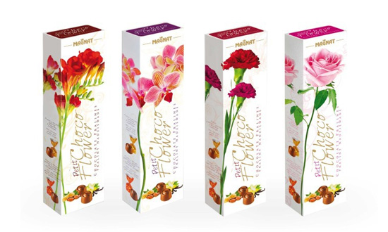 這個系列的巧克力以花卉為主題,用美食傳遞美好的祝福,香草和焦糖花生兩種口味。四種包裝,代表不同的話語。