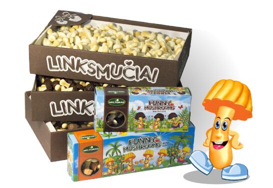 我們是立陶宛一家食品企業,主要生產的巧克力餅干,蘑菇狀造型,奇趣又美味,總共有五種口味,巧克力味,白巧克力味,草莓味,香蕉味和焦糖味。多種產品規格,1 kg, 500 g, 170 g, 150 g, 100 g和60 g。