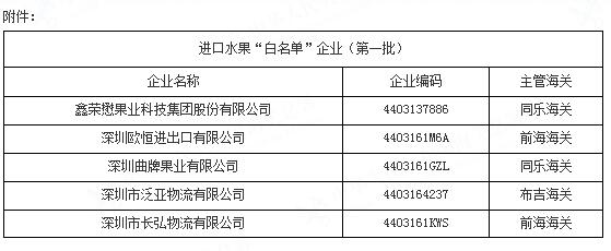 三、深圳關區進口水果“白名單”企業名單由深圳海關綜合評定后,在深圳海關網站公布并實施動態調整(第一批“白名單”企業見附件)。