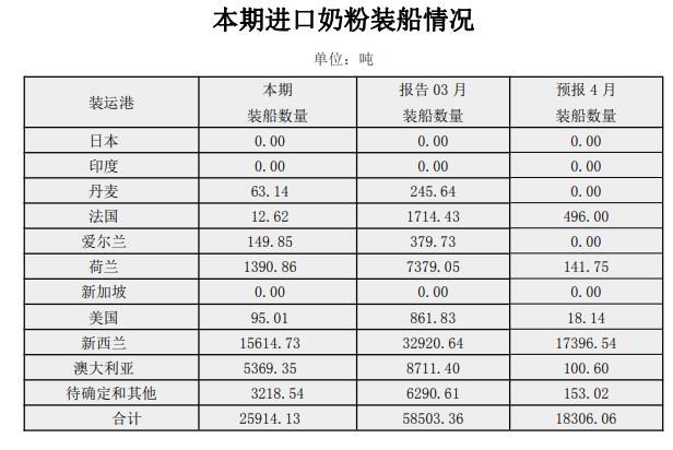 奶粉: 本期進口實際裝船 25914.13 噸,本月進口預報裝船 58503.36 噸,下月進口預報裝船 18306.06 噸。