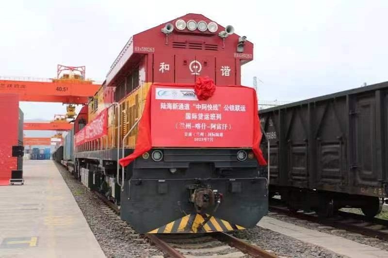 圖為:陸海新通道“中阿快線”公鐵聯運國際貨運班列 王洪亮/攝