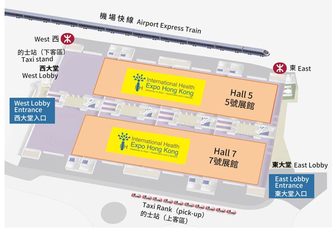 香港國際健康博覽在靠近香港國際機場的香港亞洲國際博覽館舉行。您可以乘坐各種公共交通工具輕松前往會場: