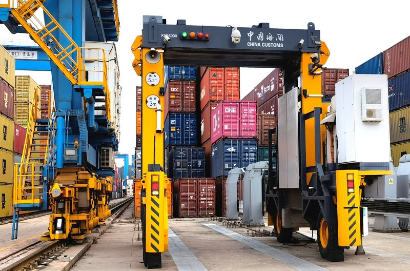 圖為:海關設置在青島港全自動化集裝箱碼頭內的“先期機檢”設備 張逸雷/攝