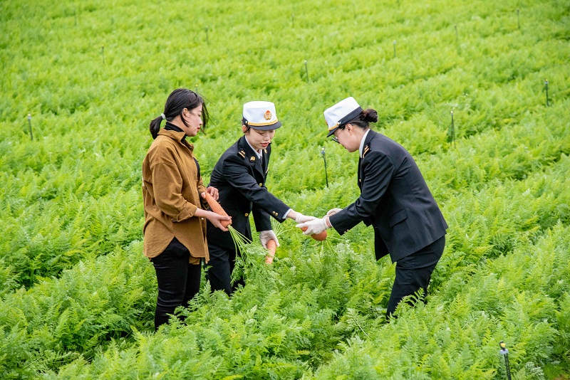 圖為:關員深入種植基地查看出口胡蘿卜長勢情況 袁國宏/攝